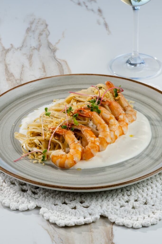 Camarões grelhados, servidos com linguine na manteiga, molho al limone e farofa de hortelã