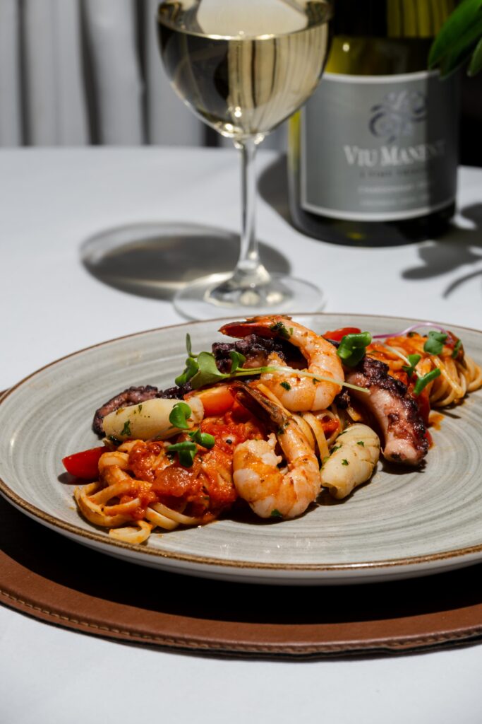 Linguine de Frutos do mar ao pomodoro artesanal e rúcula.